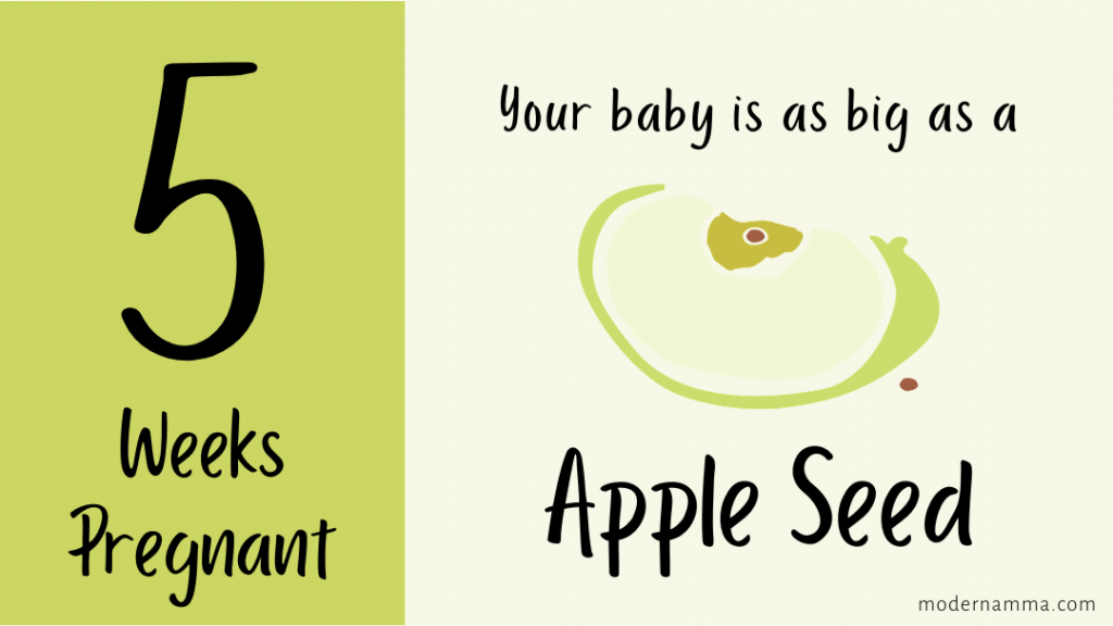 Your baby is the size of an apple seed. At 5 weeks pregnant, your embryo measures about 0.13 inches from top to bottom. Vital organs such as the heart and circulatory system are taking shape. Heartbeat begins to beat and might be detectable on ultrasound. Cells are multiplying fast and by next week your baby will double in size.